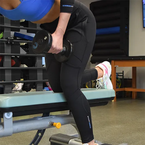 Thoughtfully placed gel-pack zones address leg, knee, and shin discomfort while maintaining a streamlined, flattering silhouette.